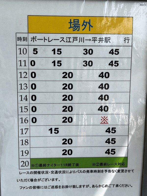 江戸川競艇場の無料バス時刻表【平井駅・船堀駅からのアクセス】